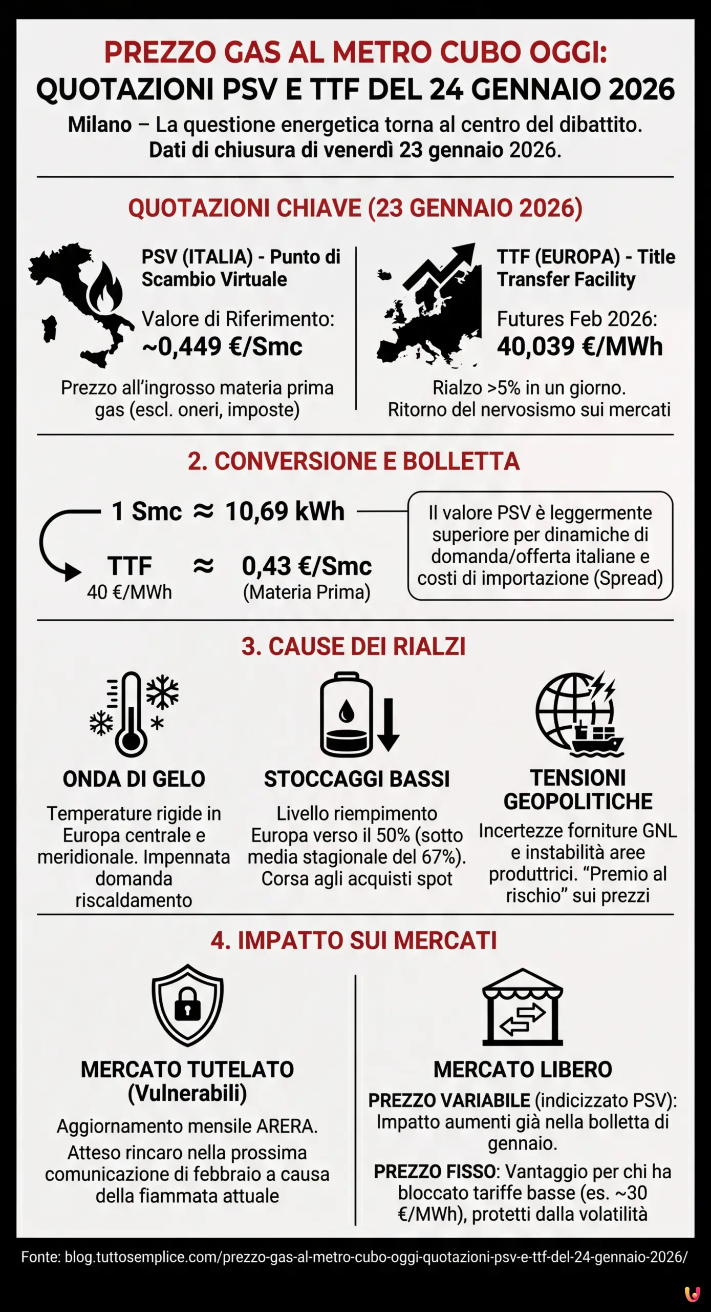 Quanto costa il gas al metro cubo oggi, 24 gennaio 2026? Analisi aggiornata del prezzo PSV e TTF, andamento dei…