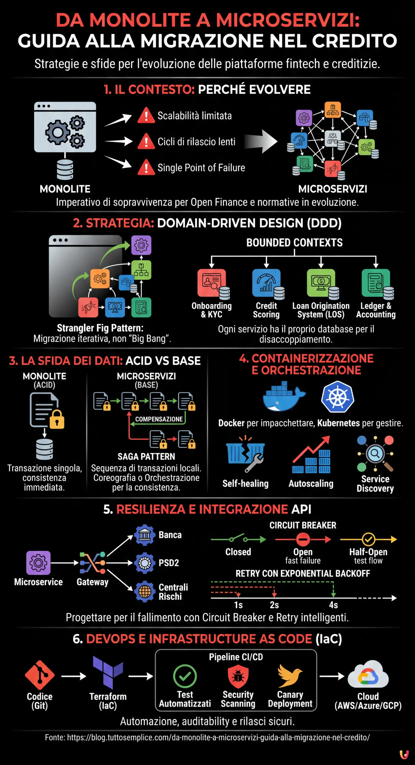 Guida tecnica per passare da monolite a microservizi nel settore creditizio. Strategie DDD, gestione dati distribuiti, Docker e resilienza operativa.