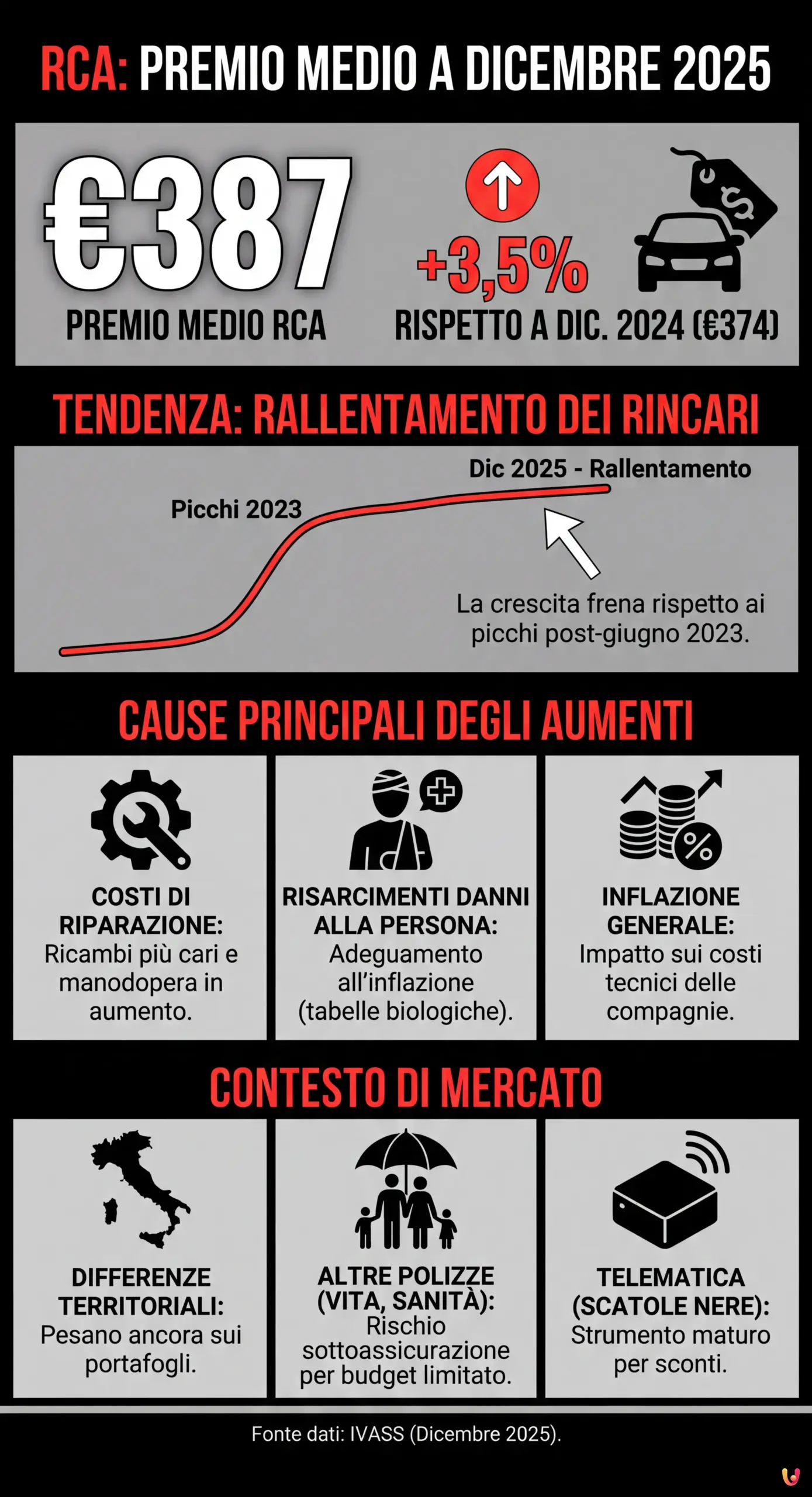 A dicembre 2025 il premio medio RCA sale a 387 euro (+3,5%). IVASS segnala un rallentamento dei rincari rispetto al…