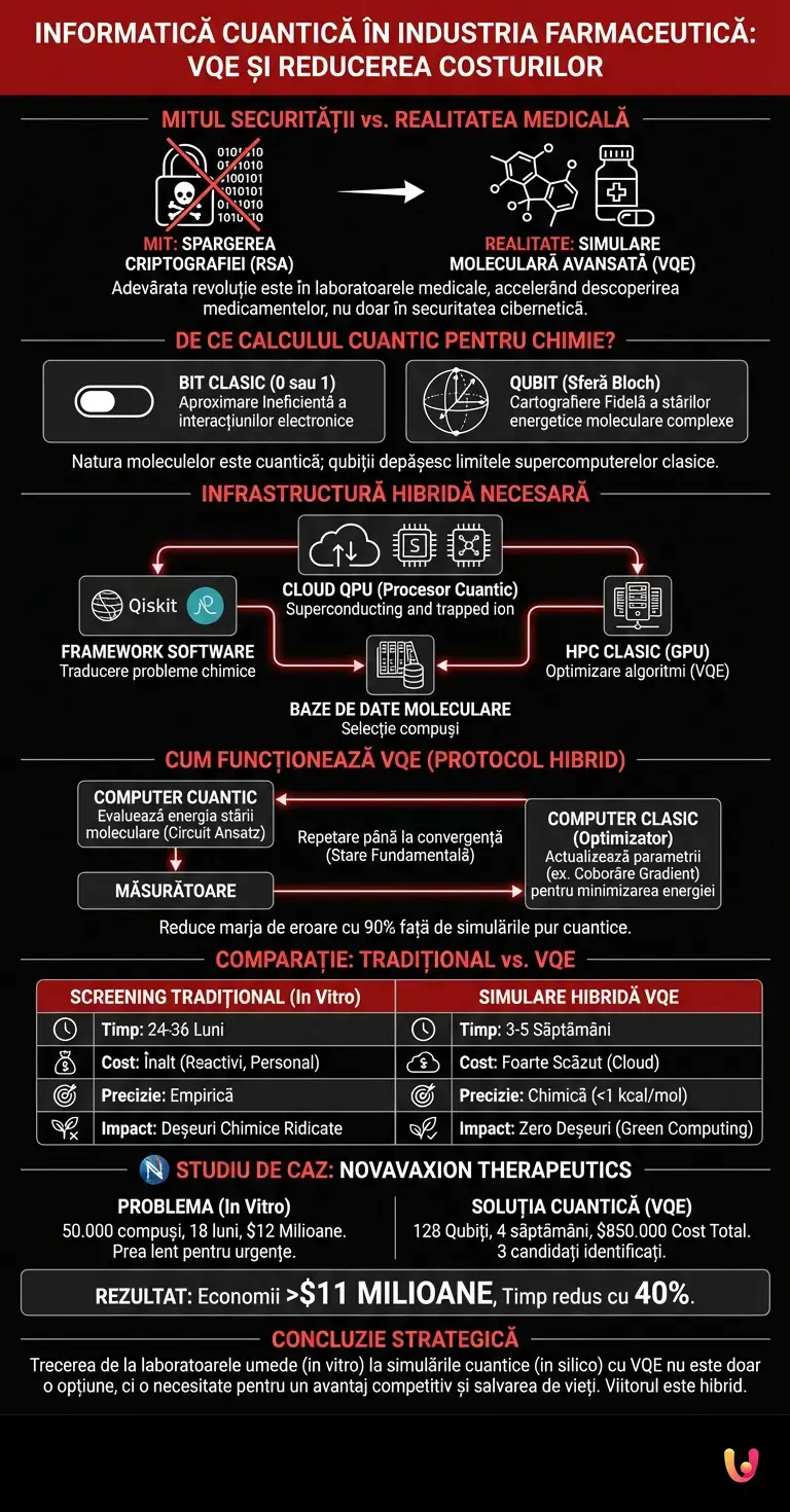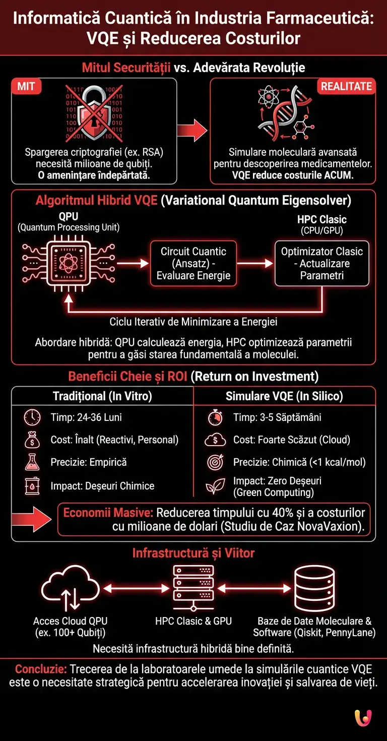 Descoperă cum informatica cuantică și protocoalele VQE reduc costurile descoperirii de medicamente. Calculează rentabilitatea investiției cu simulatorul nostru interactiv.